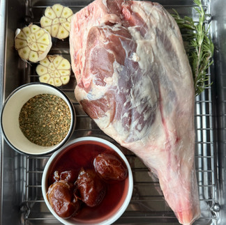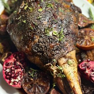 Roasted Leg of Lamb with Plums, Citrus & Red Wine